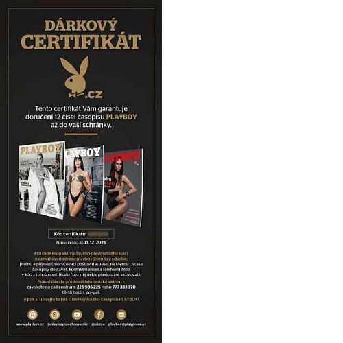 Udělejte radost svému tátovi, obchodním partnerům, kamarádům z vojny, tchánovi, šéfovi, nebo komukoliv dalšímu z vašich blízkých či přátel. Dárkový certifikát na celoroční předplatné (12 čísel) časopisu Playboy jim bude celý rok připomínat, kdo jim ho věnoval. Po úhradě, je odesílán samostatný certifikát na adresu plátce (do 4. týdnů od uhrazení) – tištěný dárkový certifikát, který je nutné dále aktivovat (obdarovaným) dle pokynů uvedených na certifikátu. Až poté obdarovaný obdrží 12 vydání časopisu Playboy. Certifikát nenahrazuje roční předplatné s dárkem.