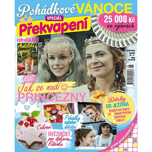 Předplaťte si nyní časopis Překvapení na čtvrt roku za akční cenu a získáte speciál Překvapení č. 8/2024 – Pohádkové Vánoce v hodnotě 24,90 Kč jako dárek. Na co všechno se můžete těšit? ABECEDA VÁNOC & Jak prožít svátky jako z POHÁDKY. Filmové kvízy Jak se NUDÍ princezny :-) a V hlavní roli strašidla. Andělské zvonění & Nápady na RETRODÁRKY. • Anketa na téma: Jakou pohádku jste měli v dětství nejraději? Cukroví – hvězdičky pro šípkovou Růženku. Krok za krokem: Jak se tvoří pohádka?Sváteční KŘÍŽOVKY A SUDOKU. Parádní VÝHRY za 25 000 Kč – PENÍZE na ruku, TELEVIZOR, smartphone, NOTEBOOK, kávovar, knižní dárky…